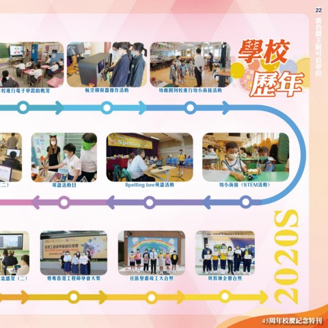 22 嗇 色 園 主 學校 辦 可 信 學 校 歷年 本校進行電子學習的概況 航空模擬器操作活動 幼稚園到校進行幼小銜接活動 進行網上學習(二) 英語活動日 Spelling bee英語活動 幼小銜接(STEM活動) 嗇色園屬校到校交流盛況(二) 勇奪香港工程師學會大獎 社區壁畫竣工大合照 與教練全體合照 2020S 45周年校慶紀念特刊