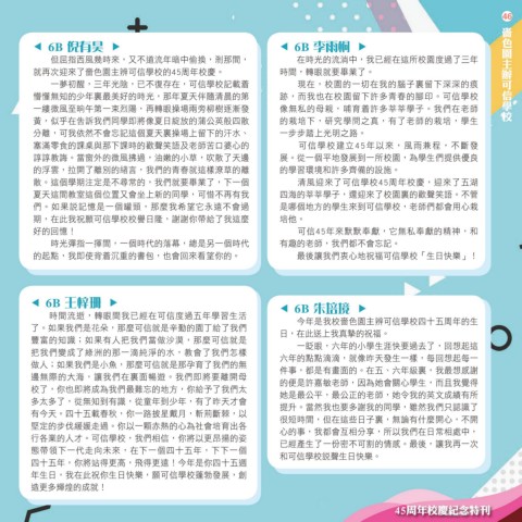 期,在此我祝願可信學校校譽日隆,謝謝你帶給了我這麼 培他。