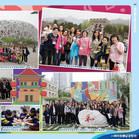 66 嗇 色 園 主 辦 可 信 學 校 大家記得為何要興建這座建築物?無錯,就 是2008年北京奧運而建的「鳥巢」。 我們能成這段長城路,都算是一個「好漢」了! 來到天安門廣場,當然要影翻張大合照啦! 大家有沒有親手包過餃子呢 ?原來要用大量的耐性去包的。 那一刻,我開始感受 到媽媽每天的辛勞了。 我們與北京安慧北里小學的學生交流,實在很高興! 45周年校慶紀念特刊