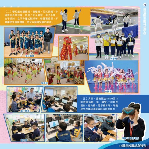 76 嗇 (二)學校還有獅藝班、劍擊班、花式跳繩、中 色 國舞及各項球隊,如男∕女子籃球、男子手球、 園 女子排球、女子非撞式欖球等,皆屢獲獎項。不 主 單讓學生鍛鍊體能,更可以磨練堅毅的意志。 辦 可 信 學 校 女子籃球 劍擊班 獅藝班 中國舞 (三)另外,還有配合STEM及IT 的教學活動,如:導覽∕VR軟件 製作、魔力橋、電子積木等,培養 學生思維和運用資訊科技的能力。 電子積木 導覽VR 軟件製作 魔力橋 45周年校慶紀念特刊