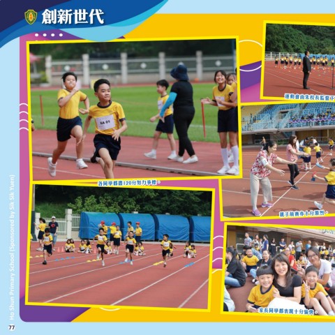 創新世代 運動會由朱校長監誓下 展開。 Ho Shun Primary School (Sponsored by Sik Sik Yuen) 各同學都盡120分努力爭標。 親子競賽亦十分激烈。 家長同學都表現十分愉快。 77