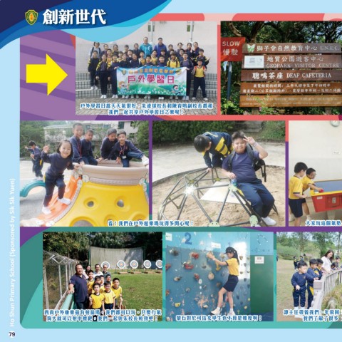 創新世代 戶外學習日當天天氣很好,朱遠球校長和陳育鳴副校長都和 我們一起共享戶外學習日之樂呢! Ho Shun Primary School (Sponsored by Sik Sik Yuen) 看!我們在戶外遊樂埸玩得多開心呢! 大家玩這個氣墊 餅球機時,玩得很投入啊! 西貢戶外康樂營有射箭場,我們都可以玩。只要力氣 譚主任帶着我們一年級同 學遊獅子會自然教育中心, 夠大就可以射中標靶,我們一起與朱校長較勁吧! 攀石對於可信女學生也不算是難度啊! 我們了解了很多 大自然的資訊。 79