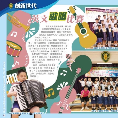 遊、律動配合歌唱等,在準備比賽過程中, 這班孩子選用了顏色鮮明的道具,令整個表演增色不少!