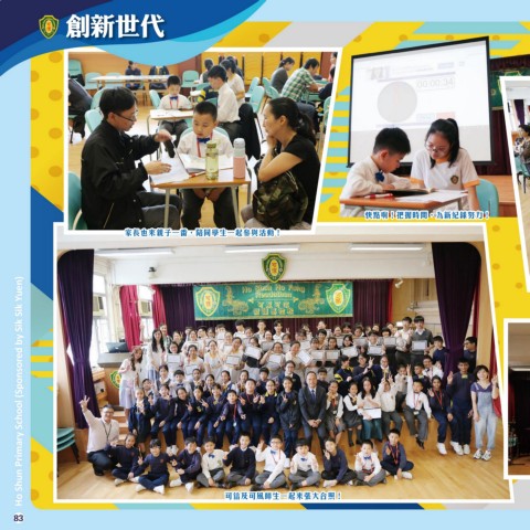 創新世代 快點啊!把握時間,為新紀錄努力! 家長也來親子一番,陪同學生一起參與活動! Ho Shun Primary School (Sponsored by Sik Sik Yuen) 多年的記錄,每年也不斷努力打破,再創高峯! 可信及可風師生一起來張大合照! 83