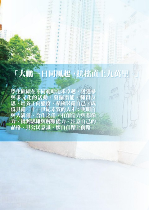 「大鵬一日同風起,扶搖直上九萬里。」 學生繼續在不同範疇追求卓越,透過參 與多元化的活動,發掘潛能,懂得反 思,培養正向態度,積極裝備自己,成 為具備二十一世紀素質的人才;更明白 與人溝通、合作之道、有創造力與想像 力、批判思維與解難能力、注意自己的 品格、具公民意識,懷自信踏上前路。