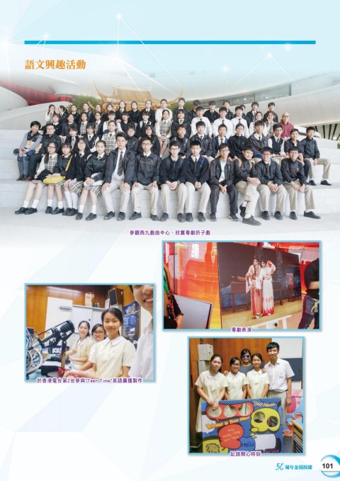 語文興趣活動 參觀西九戲曲中心,欣賞粵劇折子戲 粵劇表演 於香港電台第2台參與"Teen Time"英語廣播製作 記錄開心時刻 50 周年金禧校慶 101