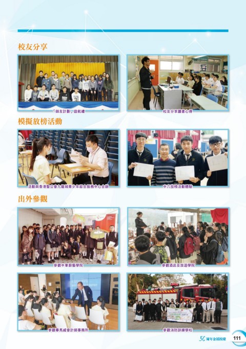 校友分享 「師友計劃」啟航禮 校友分享讀書心得 模擬放榜活動 活動與香港聖公會九龍城青少年綜合服務中心合辦 中六放榜活動體驗 出外參觀 參觀中華廚藝學院 參觀酒店及旅遊學院 參觀畢馬威會計師事務所 參觀消防訓練學校 50 周年金禧校慶 111