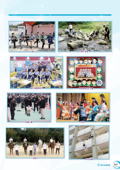 日營 野外考察 課外活動聯招日 班際相框設計比賽 跳繩比賽 話劇 騎馬 校內游繩 50 周年金禧校慶 117