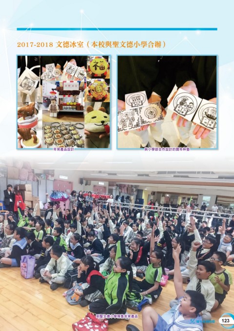 2017-2018 文德冰室(本校與聖文德小學合辦) 年宵產品設計 與小學部合作設計的賀年杯墊 到聖文德小學預售年宵產品 50 周年金禧校慶 123