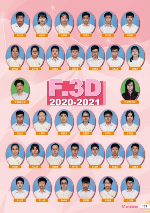 陳文齊 陳思敏 陳穎妍 周願恒 陳向權 陳梓軒 鄭梓詠 張芊怡 張健成 張日楠 蔡昊霖 朱柏熹 霍煒詩 F.3D 2020-2021 黃錦雄老師 甄麗芳老師 傅俊然 甘穎琪 關銳濤 黃慧柔 高子軒 黎月嘉 林翠鈴 林芷妍 林茵曦 林宇軒 李汶叡 廖逸朗 馬偉乘 麥逸涵 莫一德 謝卓玲 謝霆賢 董樂瑤 汪佳駿 50 周年金禧校慶 139