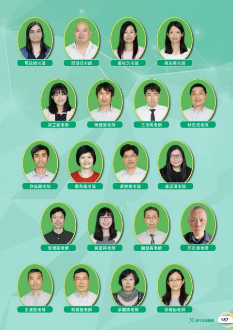 馬詠姚老師 鄧健邦老師 黃桂芳老師 孫琬茜老師 梁芷銦老師 陳健榮老師 王浩明老師 林志成老師 許庭朗老師 鄺燕儀老師 黃錦雄老師 唐潔珊老師 曾德榮老師 黃星婷老師 趙健英老師 郭志偉老師 王漢堅老師 蔡錦雄老師 梁麗卿老師 徐婉怡老師 50 周年金禧校慶 157