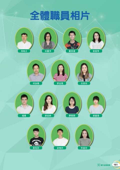 全體職員相片 馮唯正 林曼萍 羅家健 黎愛琴 何詠聰 郭金鳳 冼家欣 楊蓁 郭奕婷 廖雅穎 鄧嘉雯 黃柏欣 梁悛非 李庭欣 50 周年金禧校慶 161