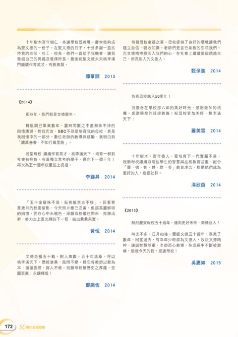 十年樹木百年樹仁,多謝學校既教導。慶幸能夠成 恭賀母校金禧之喜。母校提供了良好的環境讓我們