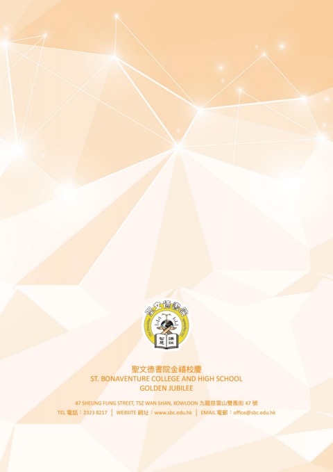 聖文德書院金禧校慶 ST. BONAVENTURE COLLEGE AND HIGH SCHOOL GOLDEN JUBILEE 47 SHEUNG FUNG STREET, TSZ WAN SHAN, KOWLOON 九龍慈雲山雙鳳街 47 號 I I TEL 電話:2323 8217 WEBSITE 網址:www.sbc.edu.hk EMAIL 電郵:office@sbc.edu.hk