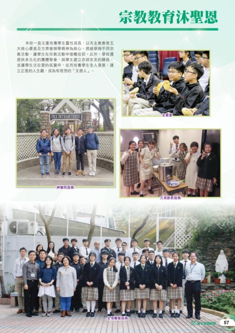宗教教育沐聖恩 本校一直注重培養學生靈性成長,以天主教教育五 大核心價值及方濟會辦學精神為核心,透過舉辦不同宗 教活動,讓學生在宗教活動中接觸信仰。此外,學校還 提供多元化的團體聚會,與學生建立亦師亦友的關係, 並讓學生活在愛的氛圍中,從而培養學生全人發展,建 立正面的人生觀,成為有理想的「文德人」。 全貧宴 神樂院服務 方濟廚房服務 全情觸覺服務 50 周年金禧校慶 57