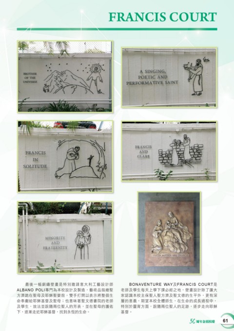 ALBANO POLI專門為本校設計及製造,藝術品描繪聖 老師及學生每天上學下課必經之地,壁畫設計除了讓大