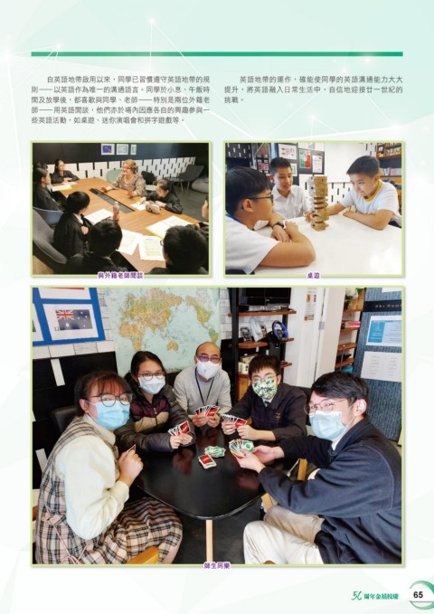 自英語地帶啟用以來,同學已習慣遵守英語地帶的規 英語地帶的運作,確能使同學的英語溝通能力大大 則—以英語作為唯一的溝通語言。同學於小息、午飯時 提升,將英語融入日常生活中,自信地迎接廿一世紀的 間及放學後,都喜歡與同學、老師—特別是兩位外籍老 挑戰。 師—用英語閒談,他們亦於場內因應各自的興趣參與一 些英語活動,如桌遊、迷你演唱會和拼字遊戲等。 與外籍老師閒談 桌遊 師生同樂 50 周年金禧校慶 65