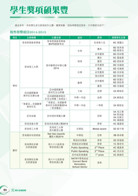 過去多年,本校學生多次參與校外比賽,獲獎無數。因為得獎項目眾多,只列舉部分如下: