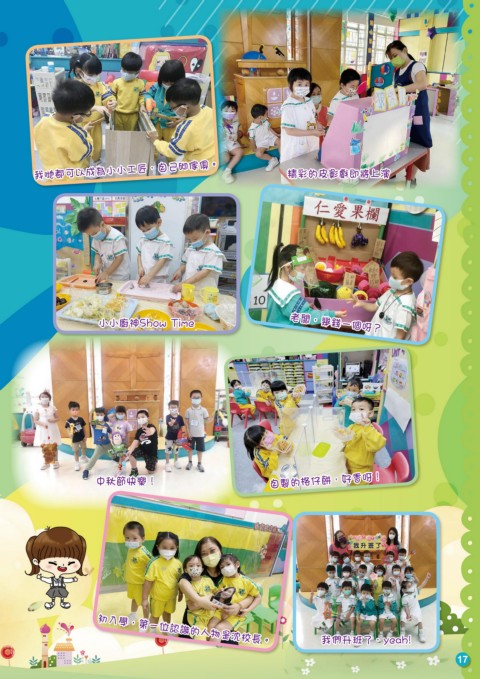我哋都可以成為小小工匠,自己砌傢俱。 精彩的皮影戲即將上演 小小廚神Show Time 老闆,幾錢一個呀? 中秋節快樂! 自製的格仔餅,好香呀! 我們升班了,yeah! 初入學,第一位認識的人物是沈校長。 17