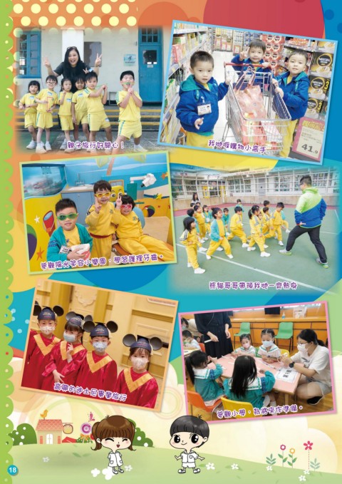 親子旅行好開心! 我哋喺購物小高手 參觀陽光笑容小樂園,學習護理牙齒。 熊貓哥哥帶領我哋一齊熱身 高興的迪士尼畢業旅行 參觀小學,為將來作準備。 18