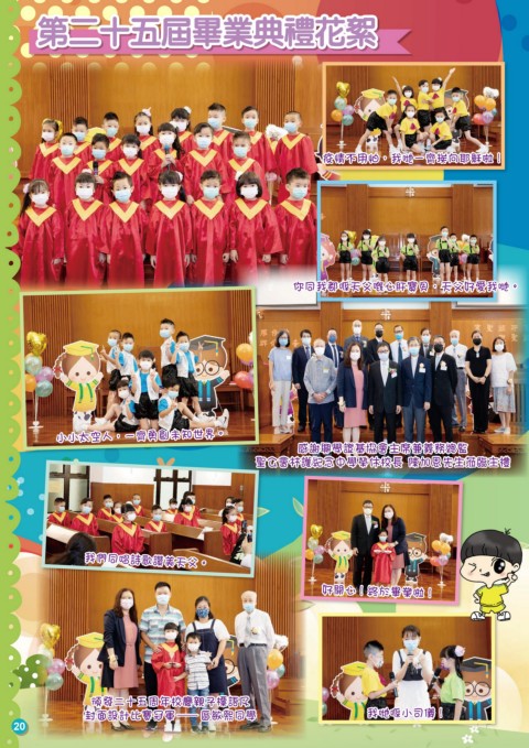 第二十五屆畢業典禮花絮 疫情不用怕,我哋一齊挨向耶穌啦! 你同我都喺天父嘅心肝寶貝,天父好愛我哋。 小小太空人,一齊勇創未知世界。 感謝興學證基協會主席兼義務總監 聖公會林護紀念中學榮休校長 陳加恩先生蒞臨主禮 我們同唱詩歌讚美天父。 好開心!終於畢業啦! 頒發二十五周年校慶親子標語及 封面設計比賽冠軍—區敏熙同學 我哋喺小司儀! 20