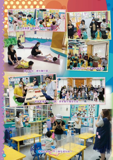 感謝義工姨姨陪伴我們閱讀 家長與幼兒一起跳親子讚美操 親子瑜伽,增加親切感。 參與家福會社工活動,齊來製作環保玩具 家長的參與,令小朋友特別投入。 28