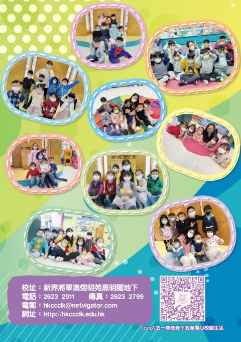 校址:新界將軍澳煜明苑熹明閣地下 電話:2623 2911 傳真:2623 2799 電郵:hkccclk@netvigator.com 網址:http://hkccclk.edu.hk scan入去一齊感受下我哋開心校園生活