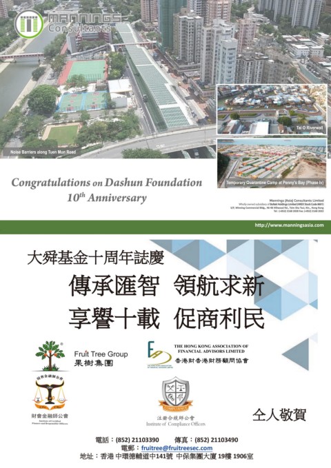大舜基金十周年誌慶 傳承匯智 領航求新 享譽十載 促商利民 仝人敬賀 電話:(852) 21103390 傳真:(852) 21103490 電郵:fruitree@fruitreesec.com 地址:香港 中環德輔道中141號 中保集團大廈 19樓 1906室