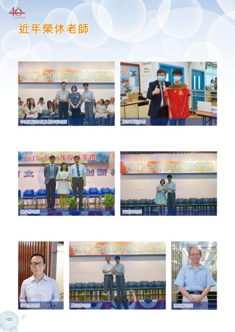 近年榮休老師 近年榮休老師 李慧蘭副校長及劉岸韶老師 葉存楫副校長 李慧蘭副校長及劉岸韶老師 葉存楫副校長 黃秀英老師 蔡小雪老師 蔡小雪老師 黃秀英老師 鍾國輝老師 許遠基老師 鍾國輝老師 陳星輝老師 許遠基老師 陳星輝老師 102