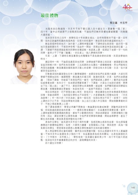 身為中五學生,能見證辛亥年四十周年校慶,我感到無比感恩和自豪,但也煩惱着