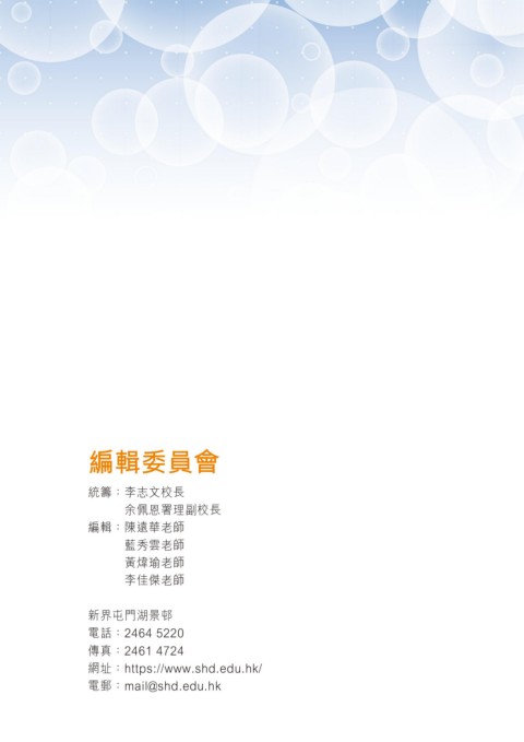編輯委員會 編輯委員會 統籌:李志文校長 余佩恩署理副校長 編輯:陳遠華老師 藍秀雲老師 黃煒瑜老師 李佳傑老師 新界屯門湖景邨 電話:2464 5220 傳真:2461 4724 網址:https://www.shd.edu.hk/ 電郵:mail@shd.edu.hk