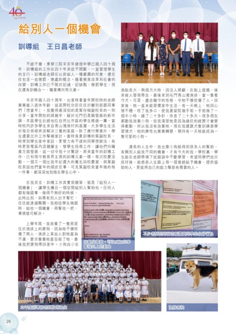 業方面發展,這一切令我十分驚訝,原來當年的訓導工 有賴別人給我不同的機會,才有今天的我。學校裏,學
