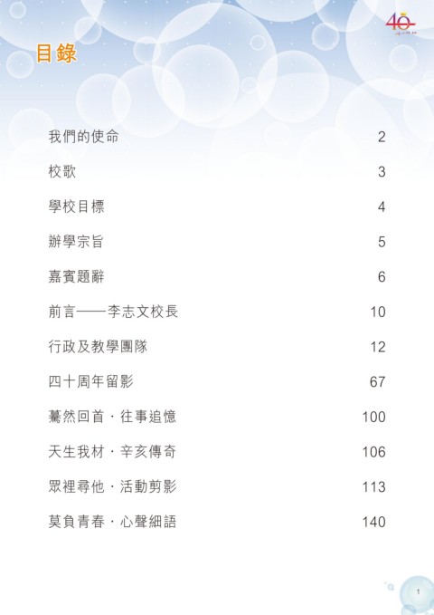 目錄 目錄 我們的使命 2 校歌 3 學校目標 4 辦學宗旨 5 嘉賓題辭 6 前言—李志文校長 10 行政及教學團隊 12 四十周年留影 67 驀然回首.往事追憶 100 天生我材.辛亥傳奇 106 眾裡尋他.活動剪影 113 莫負青春.心聲細語 140 1