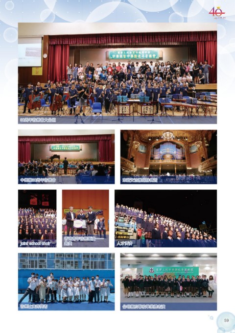 30周年音樂會大合照 30周年音樂會大合照 東歐交流團綵排練習 中樂團30周年音樂會 中樂團30周年音樂會 東歐交流團綵排練習 香港青年音樂匯演 香港青年音樂匯演— — 銀獎 joint school choir 銀獎 人才濟濟 joint school choir 人才濟濟 音樂比賽得獎者 合唱團於聯校畢業禮表演 音樂比賽得獎者 合唱團於聯校畢業禮表演 59
