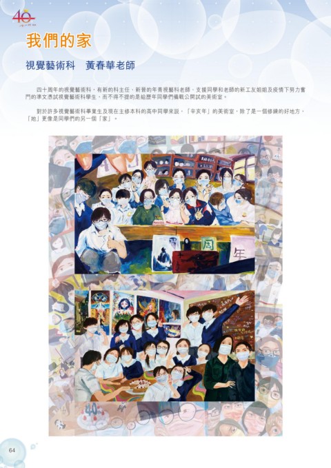 我們的家 我們的家 視覺藝術科 黃春華老師 四十周年的視覺藝術科,有新的科主任、新晉的年青視藝科老師、支援同學和老師的新工友姐姐及疫情下努力奮 鬥的準文憑試視覺藝術科學生,而不得不提的是給歷年同學們備戰公開試的美術室。 對於許多視覺藝術科畢業生及現在主修本科的高中同學來說,「辛亥年」的美術室,除了是一個修練的好地方, 「她」更像是同學們的另一個「家」。 64