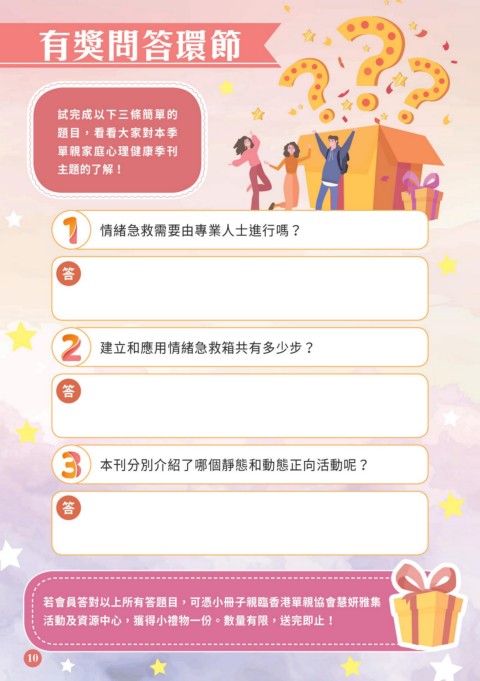 有獎問答環節 試完成以下三條簡單的 題目,看看大家對本季 單親家庭心理健康季刊 主題的了解! 情緒急救需要由專業人士進行嗎? 答 建立和應用情緒急救箱共有多少步? 答 本刊分別介紹了哪個靜態和動態正向活動呢? 答 若會員答對以上所有答題目,可憑小冊子親臨香港單親協會慧妍雅集 活動及資源中心,獲得小禮物一份。數量有限,送完即止! 10
