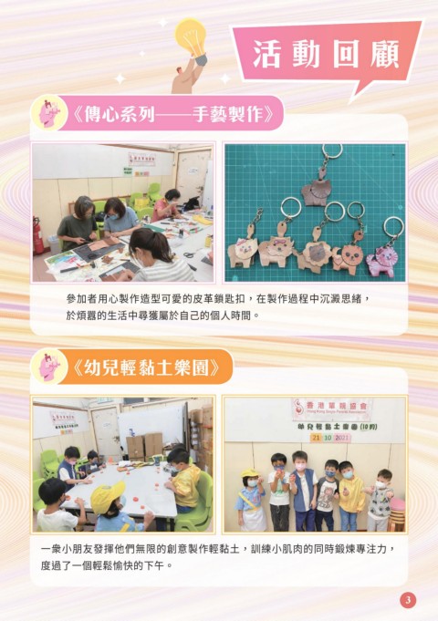活動回顧 《傳心系列 手藝製作》 參加者用心製作造型可愛的皮革鎖匙扣,在製作過程中沉澱思緒, 於煩囂的生活中尋獲屬於自己的個人時間。 《幼兒輕黏土樂園》 一衆小朋友發揮他們無限的創意製作輕黏土,訓練小肌肉的同時鍛煉專注力, 度過了一個輕鬆愉快的下午。 3