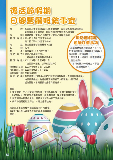 費 用:每節$20.4(不包括午膳) 對復活節假期日間暫顧服務有以下