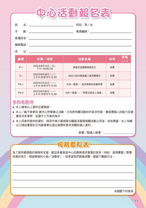 ● 本人/敝子弟參加 貴中心所舉辦之活動,已知悉有關活動的內容及性質,會因應個人的能力及健