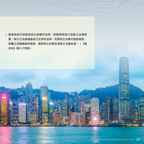 香港特別行政區政府必須遵守法律,對香港特別行政區立法會負 責:執行立法會通過並已生效的法律;定期向立法會作施政報告; 答覆立法會議員的質詢;徵稅和公共開支須經立法會批准。(《基 本法》第六十四條) Essential Basic Law Knowledge for College Students 17