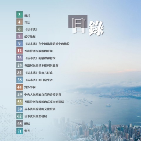 3 前言 目 4 背景 目 6 《基本法》 錄 7 起草過程 9 《基本法》在中國法律體系中的地位 12 香港特別行政區的藍圖 26 《基本法》的解釋和修改 28 香港居民的基本權利與義務 34 《基本法》與公共財政 38 《基本法》與日常生活 44 對外事務 49 中央人民政府負責的香港事務 53 香港特別行政區的高度自治範疇 59 基本法與香港的文化發展 62 基本法與商業發展 65 總結 71 參考