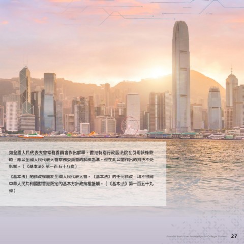 如全國人民代表大會常務委員會作出解釋,香港特別行政區法院在引用該條款 時,應以全國人民代表大會常務委員會的解釋為準。但在此以前作出的判決不受 影響。(《基本法》第一百五十八條) 《基本法》的修改權屬於全國人民代表大會。《基本法》的任何修改,均不得同 中華人民共和國對香港既定的基本方針政策相抵觸。(《基本法》第一百五十九 條) Essential Basic Law Knowledge for College Students 27