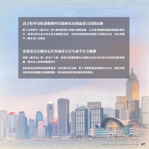 外,香港在設立官方或半官方機構的安排,及與其他國家和地區進行民間的交往,亦必須遵