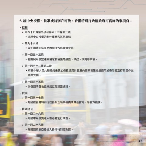 5. 經中央授權、批准或特別許可後,香港特別行政區政府可實施的事項有: