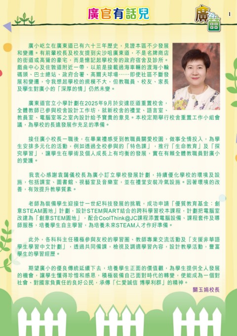 究學習」,讓學生在學術及個人成長上有均衡的發展,實在有賴全體教職員對廣小