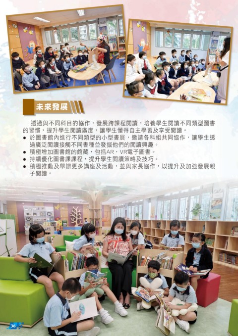 未來發展 透過與不同科目的協作,發展跨課程閱讀,培養學生閱讀不同類型圖書 的習慣,提升學生閱讀廣度,讓學生懂得自主學習及享受閱讀。 ● 於圖書館內進行不同類型的小型書展,邀請各科組共同協作,讓學生透 過廣泛閱讀接觸不同書種並發掘他們的閱讀興趣。 ● 積極增加圖書館的館藏,包括AR,VR電子圖書。 ● 持續優化圖書課課程,提升學生閱讀策略及技巧。 ● 積極推動及舉辦更多講座及活動,並與家長協作,以提升及加強發展親 子閱讀。 36 36