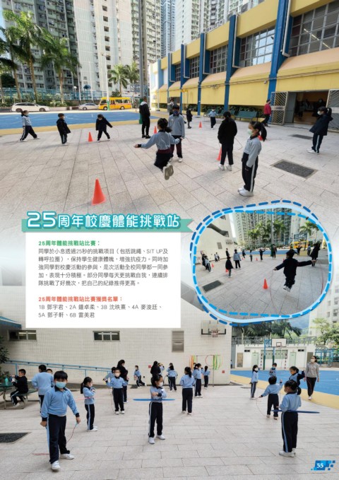 25 周年校慶體能挑戰站 25周年校慶體能挑戰站 25周年體能挑戰站比賽︰ 同學於小息透過25秒的挑戰項目(包括跳繩、SIT UP及 轉呼拉圈),保持學生健康體魄,增強抗疫力。同時加 強同學對校慶活動的參與,是次活動全校同學都一同參 加,表現十分積極。部分同學每天更挑戰自我,連續排 隊挑戰了好幾次,把自己的紀錄推得更高。 25周年體能挑戰站比賽獲獎名單: 1B 鄧宇君、2A 鍾卓柔、3B 沈昳熹、4A 麥浚廷、 5A 鄧子軒、6B 雷美君 55 55