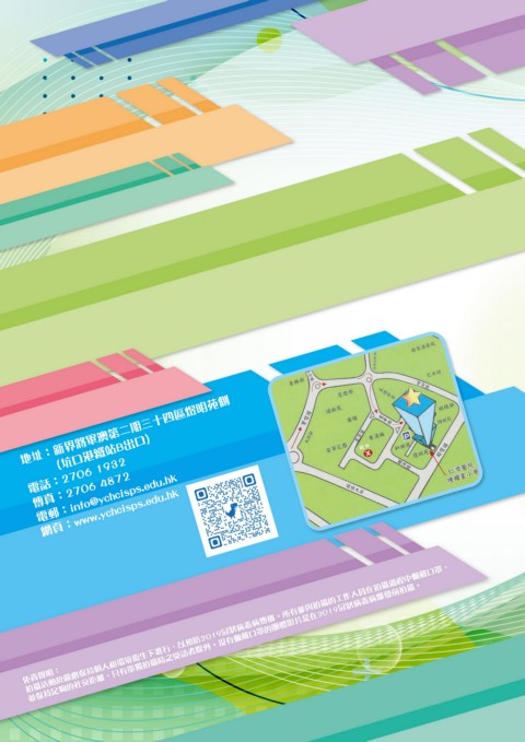 地址:新界將軍澳第二期三十四區煜明苑側 (坑口港鐵站B出口) 電話:2706 1932 傳真:2706 4872 電郵:info@ychcisps.edu.hk 網頁:www.ychcisps.edu.hk 拍攝活動於嚴格保持個人和環境衞生下進行,以預防2019冠狀病毒病傳播。所有參與拍攝的工作人員在拍攝過程中佩戴口罩, 並保持足夠的社交距離,只有單獨拍攝時之受訪者除外。沒有佩戴口罩的團體影片是在2019冠狀病毒病爆發前拍攝。 免責聲明: