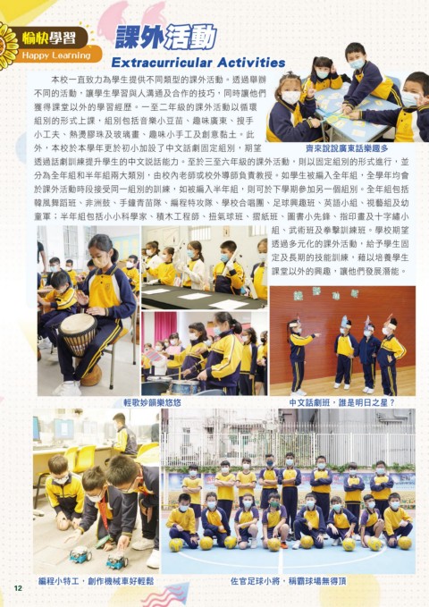 韓風舞蹈班、非洲鼓、手鐘青苗隊、編程特攻隊、學校合唱團、足球興趣班、英語小組、視藝組及幼