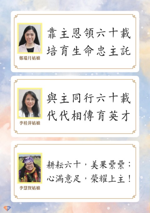 靠主恩領六十載 培育生命忠主託 鄭瑞月姑娘 與主同行六十載 代代相傳育英才 李桂萍姑娘 耕耘六十,美果纍纍; 心滿意足,榮耀上主! 李慧賢姑娘 104